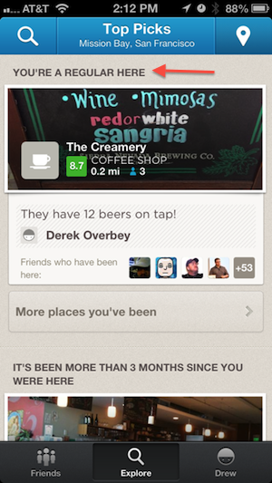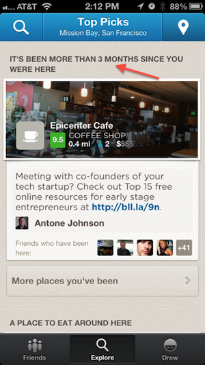 What you see above are the “reasons” why Foursquare decided to surface these two places, and it had to do with the fact that I frequent them or haven’t been there in quite a while. Couple that with the new rating system and how much my friends go, and we have a pretty awesome recommendation.