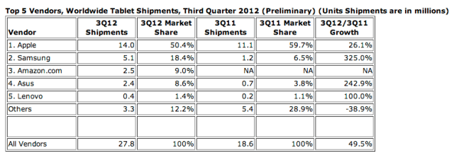 IDC also calculates that Asus — which makes Google’s Nexus 7 tablet , and recently reported a monthly sales rate for the Google-branded slate of close to one million— also grew its share over the period, rising from 3.8 percent a year ago to 8.6 percent in Q3 this year.