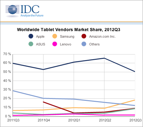 Apple’s lead in the tablet market took its first serious dent in Q3, according to estimates from analyst IDC, based on tablet shipments (rather than sales). Apple’s dominant share of the market shrunk in the third quarter of this year, dropping from 59.7 percent in the year ago period (and 65.5 percent in the second quarter of this year) to 50.4 percent in Q3 this year, while Samsung and Amazon both grew their share: Samsung took close to a fifth (18.4 percent) of the market in Q3, up from 6.5 percent in the year ago period, while Amazon grew from nothing last year to almost a tenth (9 percent) in Q3, following the launch of its original 7-inch Kindle Fire and 7-inch and 8.9-inch Kindle Fire HD tablets.