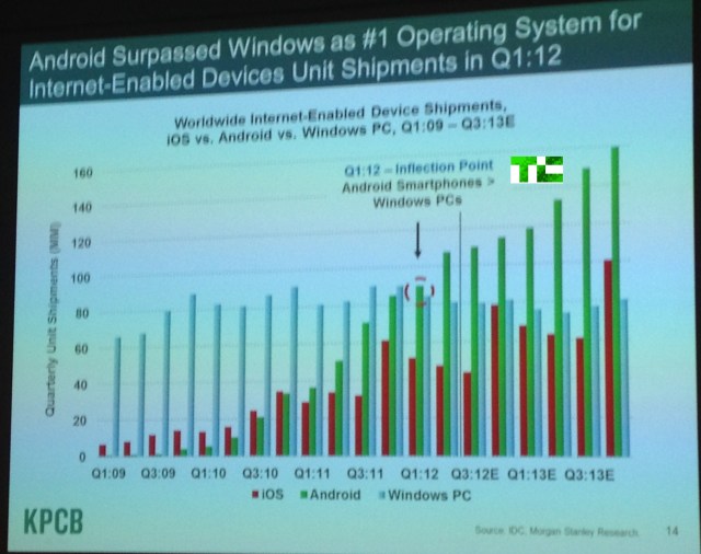Meeker says that in Q1 2012 the amount of Internet-enabled Android devices shipped surpassed the number of Windows Internet-enabled devices shipped. That was when Android was at around 90 million units shipped per quarter. By the end of 2013, Meeker expects there to be 160 million Android devices, 100 million Windows devices, and 80 million iOS devices shipped per quarter.