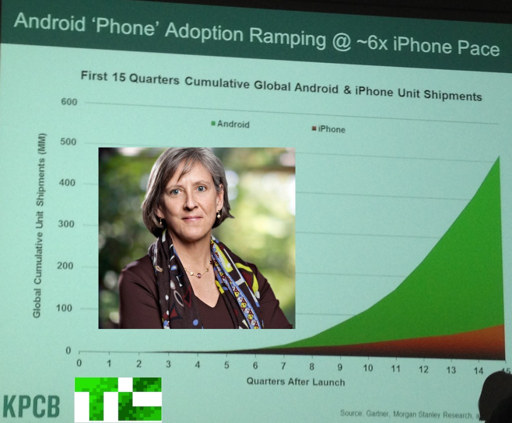 KPCB partner Mary Meeker usually publishes her famed Internet Trends report once a year, but gave a small San Francisco crowd a mid-year update tonight. The biggest new facts? Android phone adoption is ramping up six times faster than iPhone, and Android surpassed Windows as the #1 OS for Internet-enabled devices in Q1 2012. Meeker also ended the presentation by calling a statement by Mark Zuckerberg “arrogant but probably true.”
