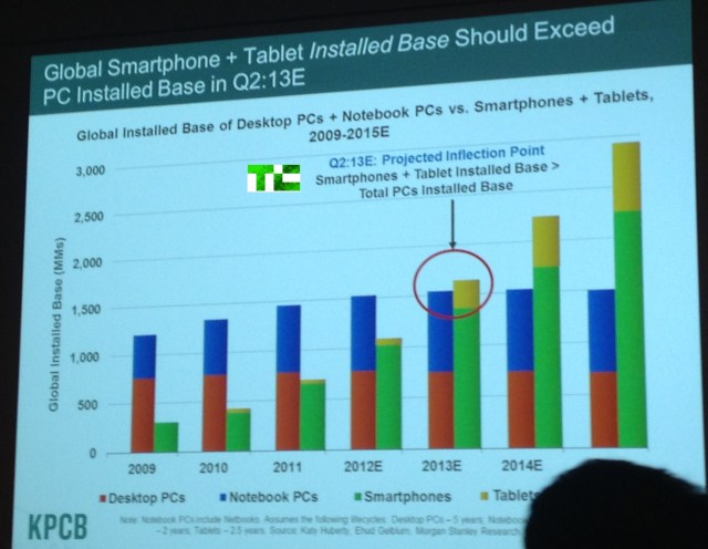 And for the last big statistic, by the end of Q2 2013, Meeker believes the global smartphone plus tablet install base will surpass the install base of the PC.