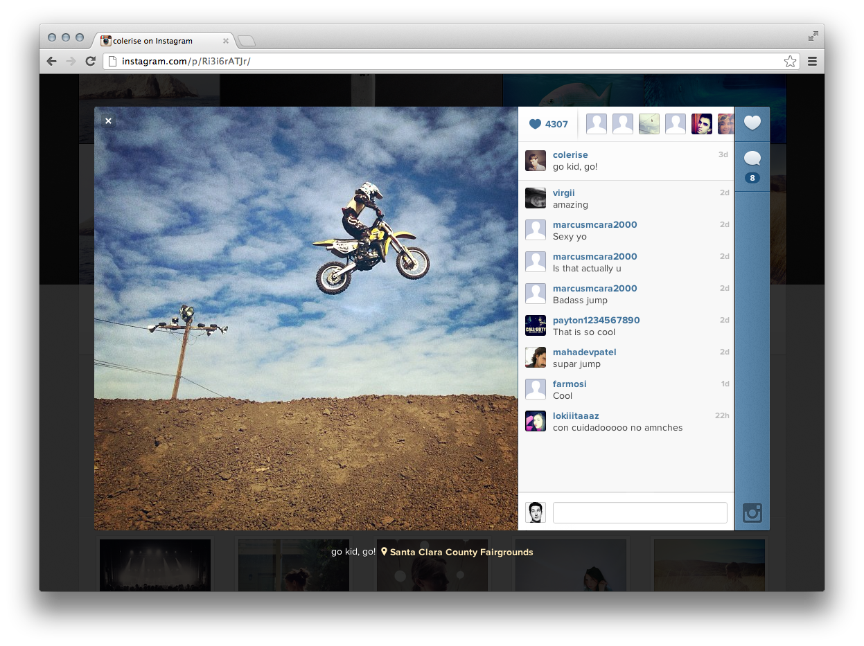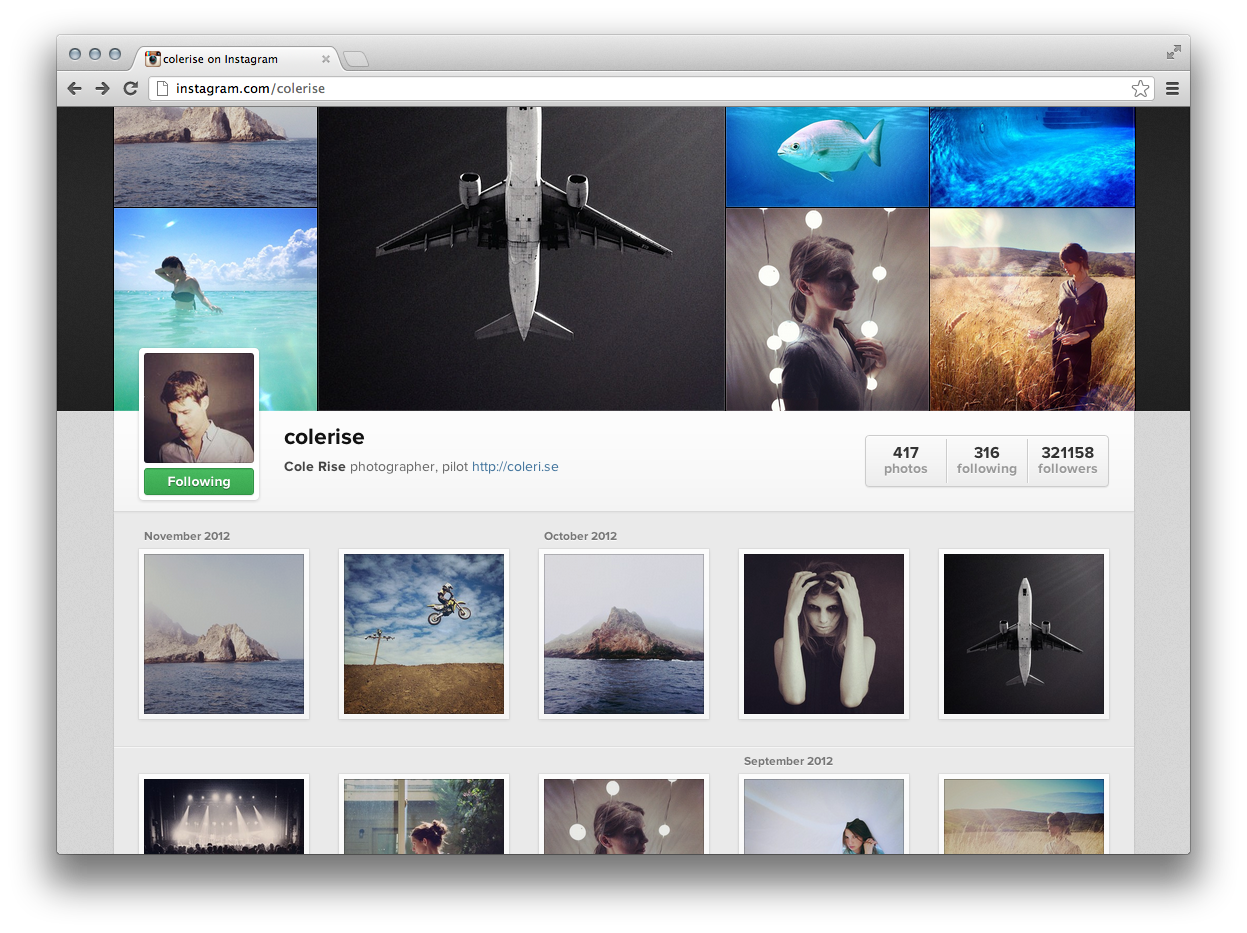 Systrom isn’t joking about the browsing focus either, in about 5 minutes I had scrolled through about two years of Instagram photos and viewed my entire life through its filtered images. The speediness of the web version is impressive, quickly unearthing photo favorites like this and this, that otherwise are lost on mobile’s infinite scroll. And, like the Instagram team I’m sure planned, I’m already sharing the Web Profile URL with folks I know who don’t use Instagram.