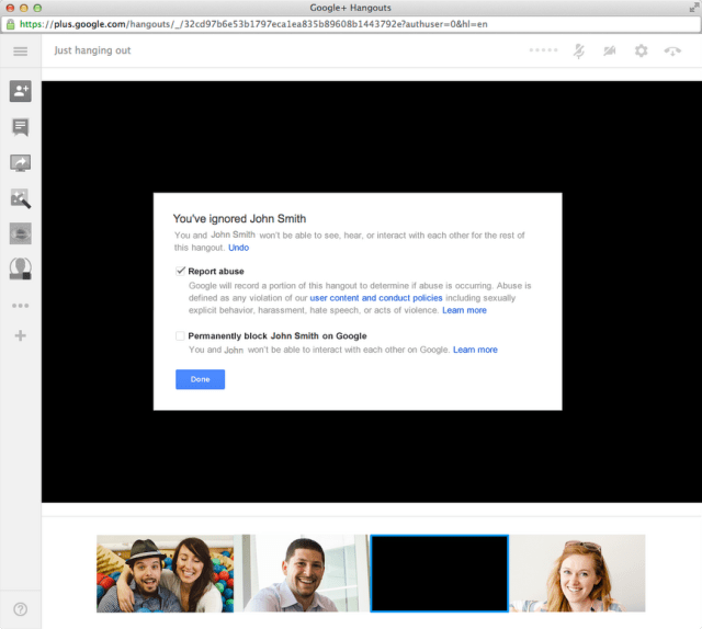 If you ignore someone in a hangout, we immediately mute their audio and video to keep you safe. Now when you report someone in a public hangout, we’ll also automatically record a small snippet and notify the room. We can then check for bad behavior—and once we’ve done that we’ll delete the clip.Thanks to millions of community members worldwide, Google+ is a secure and inspiring place to spend time. With today’s improvements, and your help, we’ll keep it that way.