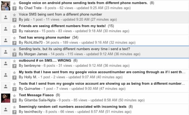 Google Voice seems to be having some issues with sending SMS messages today, as a number of blogs reported earlier this morning. The Google Voice customer support forums are filling up with complaints about text messages being sent from different phone numbers than the ones they should originate from. For some users, these numbers change every time they send a new text message, which makes it rather hard for the recipients to figure out who is trying to text them and so responses never arrive (or they go to unsuspecting users who are now confused about who is trying to text them).