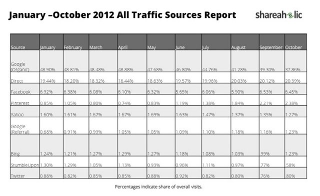 Meanwhile, in terms of driving traffic to sites, Pinterest continues to top Yahoo! organic traffic – something it first began to do in August. It’s also the fourth largest traffic driver to sites worldwide, following Google (organic), direct and Facebook, in that order. Shareaholic also saw Google’s organic traffic decline 48.88% six months ago in April to now, where it currently owns 37.86% of the traffic. Of course, Google organic traffic still leads by far over other traffic sources.