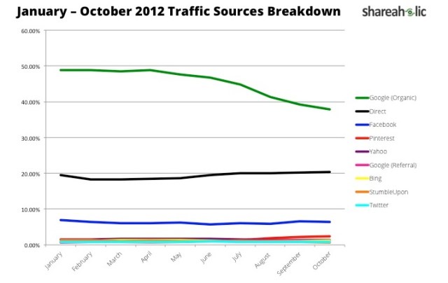 Update, 11/8/12 – StumbleUpon provided the following statement: “We do not agree with the data. Our internal data shows that since July the number of Stumbles and referral traffic have increased over that timeframe. We have connected with Shareaholic to better understand their methodology. Moving forward, we believe our redesigned web site and mobile apps will continue to deliver the best content discovery experience on the Web for our community and our partners.”