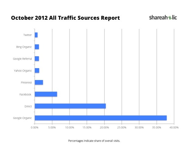 Shareaholic’s data, while only representative of the Internet as a whole, comes from a large sample. The service now includes 200,000 publishers who reach 300 million people per month.