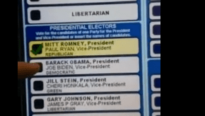 It’s not clear from the video if this was a hacking attempt, or a simple software error. On the electronic ballot, Obama’s name is right next to Mitt Romney’s, and and screen might just be misreading where the finger is touching by about an inch. Either way, the malfunction is troubling: