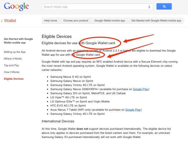 Just in case you needed more proof that the leaked news revealing a forthcoming physical Google Wallet Card is indeed legit, you can just visit Google’s own Help section on its Google Wallet website to catch a reference to the yet-to-be announced addition. On the page entitled “Eligible Devices,” Google mentions that all Android devices with an operating system of Android 2.3.3 or higher are able to download the Google Wallet app for use with the “Google Wallet card.”