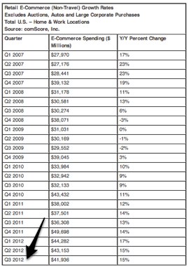 “The Q3 growth rate of 15 percent growth remained in line with the prior quarter and provided confirmation of the strength in the e-commerce sector, despite a few negative headwinds in the macroeconomic environment during the quarter,” said comScore chairman Gian Fulgoni in a release. “Such performance offers some optimism as we approach the holiday season, especially given recent improvements in consumer sentiment. With the housing market beginning to show signs of recovery in addition to increasing – if still underwhelming – job growth, there appears to be strong enough footing to support a very healthy online holiday shopping season.”