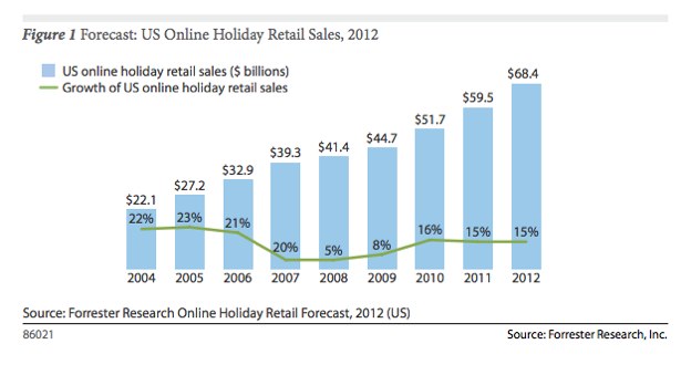 After comScore predicted a very healthy holiday shopping season for online retailers yesterday, Forrester is joining in, reporting that this holiday season is expected to generate $68.4 billion in U.S. online sales. That’s a 15 percent increase over 2011’s total and 3 percent higher than the expected overall annual online retail growth rate.
