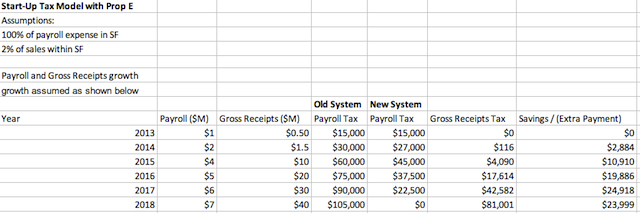 According to Dr. Ted Egan, Chief Economist at the SF City’s Controller’s Office, a typical startup with $1 million in payroll will save around $24,000 a year once Proposition E fully implemented. The law will gradually phase in until 2018. We’ve provided a spreadsheet of projected savings below. You can also access a public calculator on a Google Doc here: