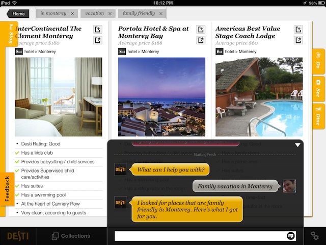 The company emerged last year from SRI International, the research institute where Siri was developed before it spun out into an independent company and then was eventually acquired by Apple. Like Siri (as well as other SRI projects, including banking-focused Lola) Desti is designed to function as a virtual personal assistant — in this case, an assistant focused on travel.
