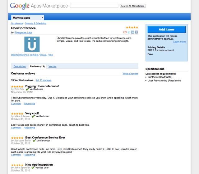 The Business service is also being made available in the Google Apps Marketplace in order to support customers already sold on cloud-based solutions like this. Here, administrators can add the UberConference app to their domain, making deployment less of a headache for end users and I.T. In Google Apps organizations, users can simply select the app from the “More” menu on Google’s black bar at the top of their page. If they don’t already have an UberConference account, it will create one immediately based on their Google Apps credentials.