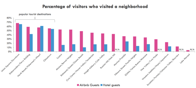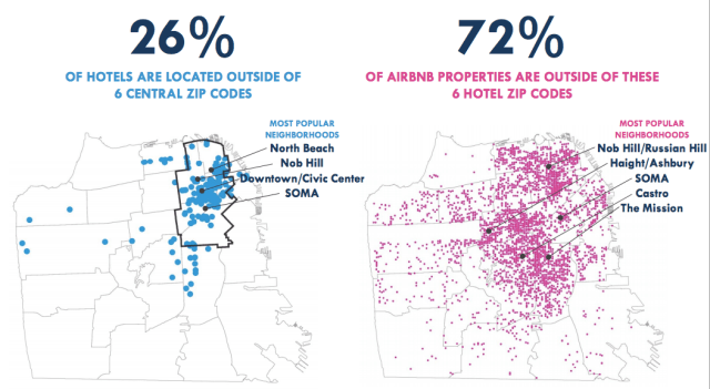 Part of the reason for that is the fact that hotel capacity has largely remained stagnant in San Francisco during that time: Airbnb public policy head Molly Turner said she’s been told there hasn’t been a new hotel built in the city in about nine years. And part of it is that Airbnb guests aren’t your typical downtown tourist types. The company’s research shows that a significant number of its guests stay in neighborhoods outside of the central hotel corridor.