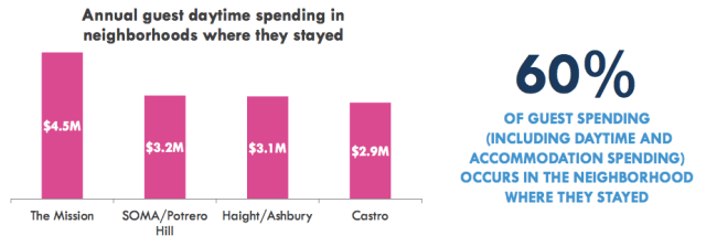 That translates into real money for neighborhood businesses in which Airbnb guests stay. The research estimates that guests spent more than $15 million in neighborhoods like The Mission, SOMA, Haight/Ashbury, and the Castro, which exist outside the usual hotel-laden areas. About 52 percent of Airbnb guests, for instance, visited The Mission, compared to 17 percent of hotel guests. Meanwhile, 49 percent of Airbnb guests visited the Richmond, Sunset, Ocean Beach, or Golden Gate Park, compared to 10 percent of hotel guests who wandered into the neighborhoods themselves, and 33 percent who sought out the park.