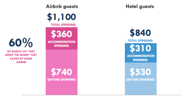 At the end of the day, that typically means they end up spending more on other things. The average Airbnb guest spends approximately $360 in lodging fees, slightly more than hotel guests — but keep in mind, they’re staying two extra days, on average. The extra time spent in town translates to significantly more daytime spending — $740 per stay, compared to $530 hotel guests. The end results is that they outspend hotel guests $1,100 to $840 per stay.