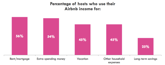 On that front, Airbnb also has research to show that its hosts are using the platform as a way to augment their own income and even pay for necessities. The research finds that approximately 60 percent of hosts make less than the median income in San Francisco. Hosts listing a whole home make an average of $9,300 per year for booking about 58 days a year, while those just listing a room make an average of $6,900 per year for 88 nights booked. According to its surveys, about 56 percent of hosts use Airbnb proceeds to help pay their rent, while 54 percent use it for extra spending money.