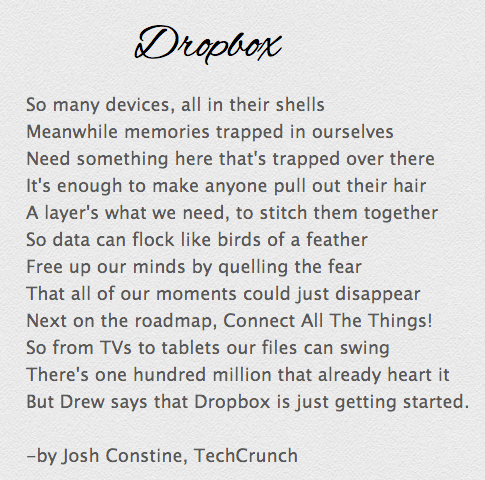 “How do I love thee, cloud storage? Let me count the ways.” You see, Dropbox’s CEO Drew Houston is an inspiring guy and a joy to talk to as a tech journalist because he’s not afraid to describe the grand vision for his company in bold quotes. So this morning after writing up my interview with him about the significance of Dropbox hitting 100 million registered users, I wrote this little poem.