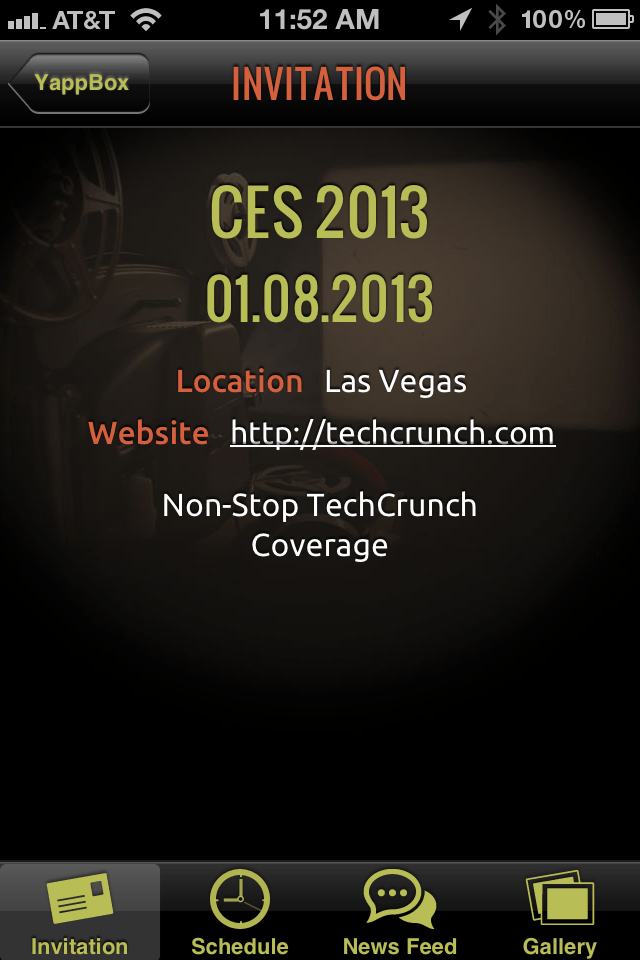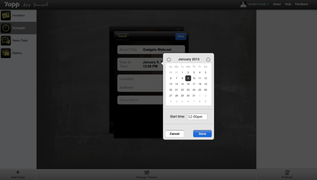 The interface for building out an app couldn’t be more clear. You start with four main pages: schedule, invitation, newsfeed, and gallery. You can add another page if you’d like. From there, you edit individual schedule entries, descriptions, and newsfeeds using the same buttons you’d press if you were using, not building, the app.