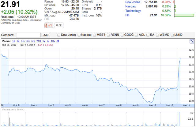 Facebook share prices are up today, with shares at 21.91, 10.32 percent above yesterday’s level. It represents a 4.6 billion market capitalization gain. Today the company is experiencing its biggest stock-lockup expiration, with 773 million Facebook shares (NASDAQ:FB) held by employees now eligible to be sold on the open market. Notably, 504 million shares held by Mark Zuckerberg are eligible, but he declared that he wouldn’t sell them. [Update: $FB ended the day up 12.6%]