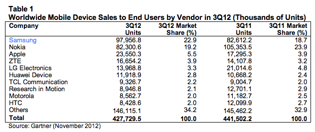 Indeed, with those strong sales for the Galaxy S III, Samsung continues to remain at the top of the pile both in smartphones and mobile handsets overall. Its share of the mobile market for Q3 was 23% compared to Nokia’s share of 19%. As you can see in the table below, it’s a reversal of their positions this time last year: