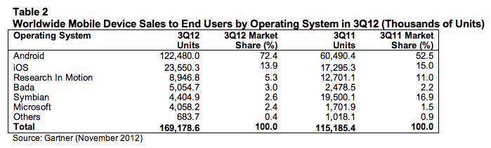 Android overall took a whopping 72% of all handset sales in the smartphone segment in the last quarter, a surge of 20 percentage points over last year. That works out to sales of 122.5 million devices, more than double what Android device makers sold in Q3 2011.