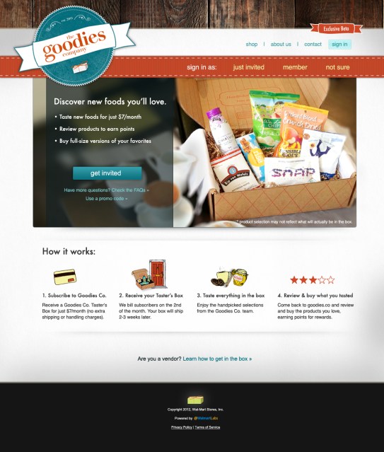 Walmart’s experimentation with subscription-based commerce continues today, with the public launch of Goodies.co, a food subscription service featuring boxes of sample-sized treats shipped monthly. The service is the latest to emerge from @WalmartLabs, the retailer’s Silicon Valley-based innovation lab focused on quickly building, launching, and testing new business models that may or may not make their way to Walmart.com or Walmart stores at a later date.