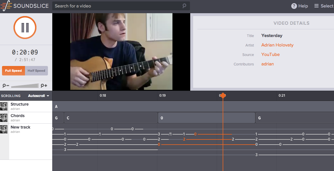 A nice byproduct, of course, is that more of us newbies might finally learn how to play guitar. I’ve got a basic six-string that has been collecting dust in my apartment for a few years now, and I’m excited to tune it up and give it another go with Soundslice (playing videos at half-speed, most likely, which is a very helpful feature of the app). Following along on the demos, such as Holovaty’s own rendition of Yesterday, actually make playing the guitar seem less intimidating than ever. All the information I need is right there in several different forms — it seems like the next best thing to having an in-person instructor, with the added bonus of being able to rewatch certain bits as many times as you need to without being an annoyance (or having to pay someone overtime).
