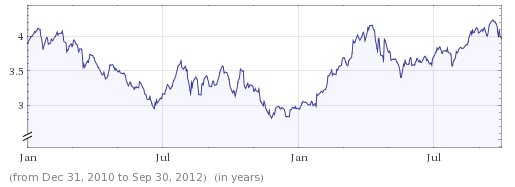 In addition to that, the ratio market capitalization over revenue has actually increased for Q3 and Q4 2012, ending September 30, 2012. It’s too early to tell whether it will decrease in Q1 2013, as Apple expects to reach its biggest revenue in company history, so the stock price could fluctuate in both directions. Nevertheless, on September 30, AAPL was trading at four times Apple’s yearly revenue. It is impressive for an established company, and even more so for a giant such as Apple.