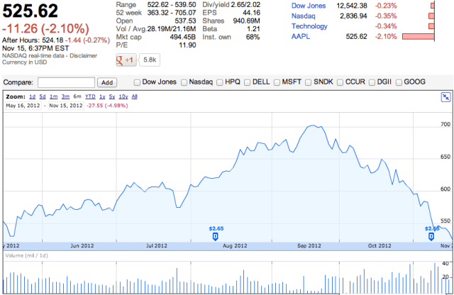 Without sounding the hyperbole alarm, let’s look at the facts. Apple’s stock price has declined steadily since September 19, two days before the iPhone 5 was released. Shares are off 25 percent since September. The stock price closed at a six-month low today. The price is still up 30 percent on the year but far from its 74 percent increase a few months back.