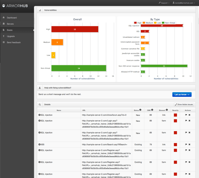 ArmorHub’s service is free to use. Just enter your URL and email address, and it can send a report to your inbox. The service checks for the highest-rated vulnerabilities in terms of impact, according to OWASP, including things like cross-site scripting and SQL injections, but it’s also capable of scanning modern web frameworks like Rails, Django, and Node.js, which are popular among startups. For small businesses, the service can comprehensively scan SMB platforms like WordPress, Magento, and Joomla. And like some website monitoring platforms, it can scan for malware, too. Of course, for sites that use ArmorHub from the start, malware shouldn’t be much of an issue.