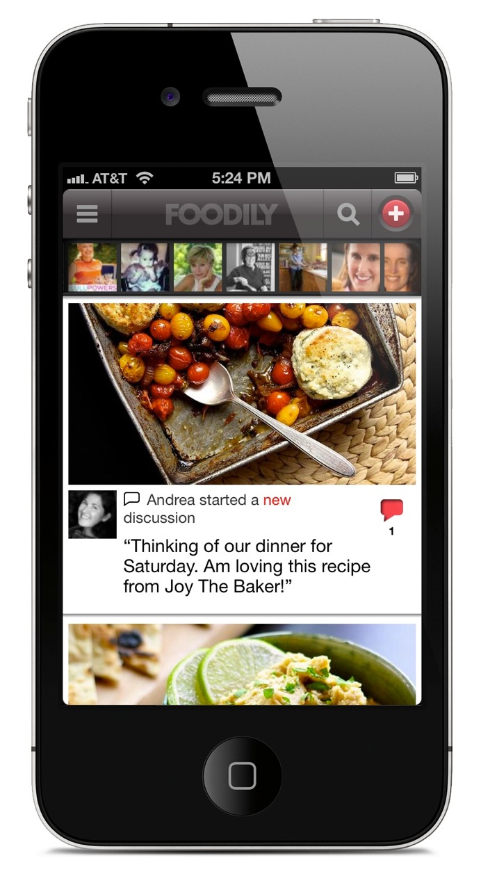 The app features a friends bar at the top, where you can immediately tap to see a friend’s activity and message them directly, or find daily picks from Foodily itself. A search option lets you search your favorite recipes, then in separate tabs see those from your friends or from a growing index of hundreds of recipe websites. And, most importantly, the red “+” plus button lets you kick off social conversations about recipes and food directly within the app.