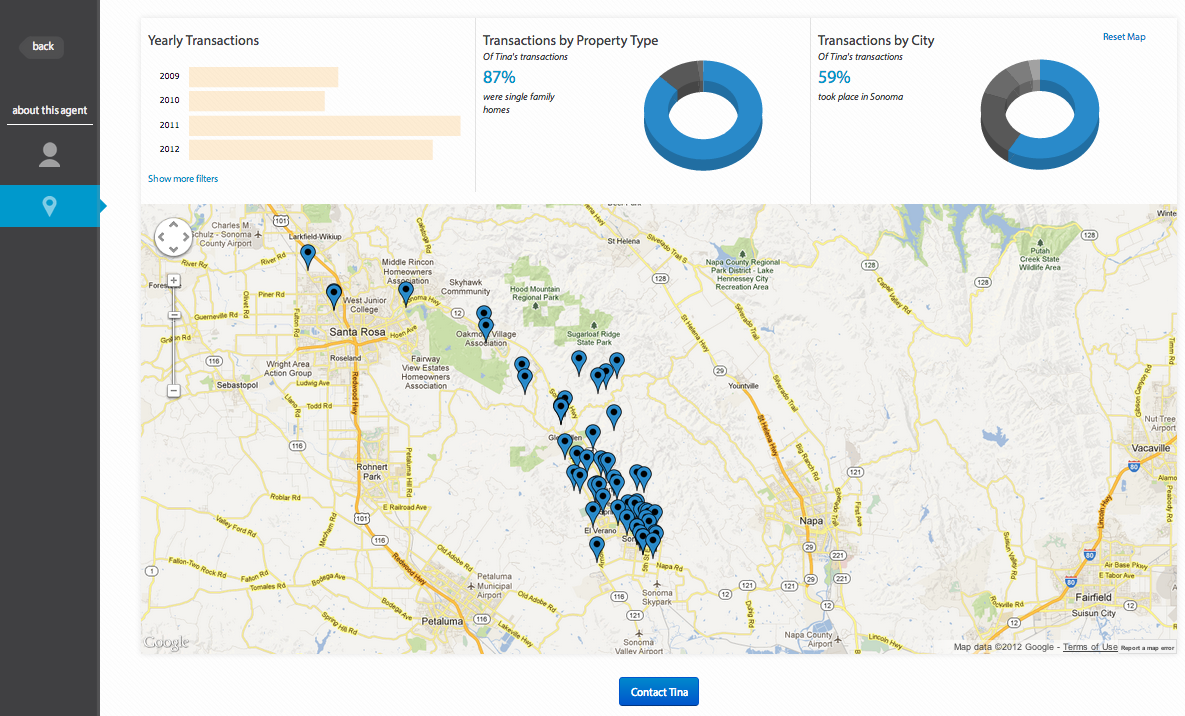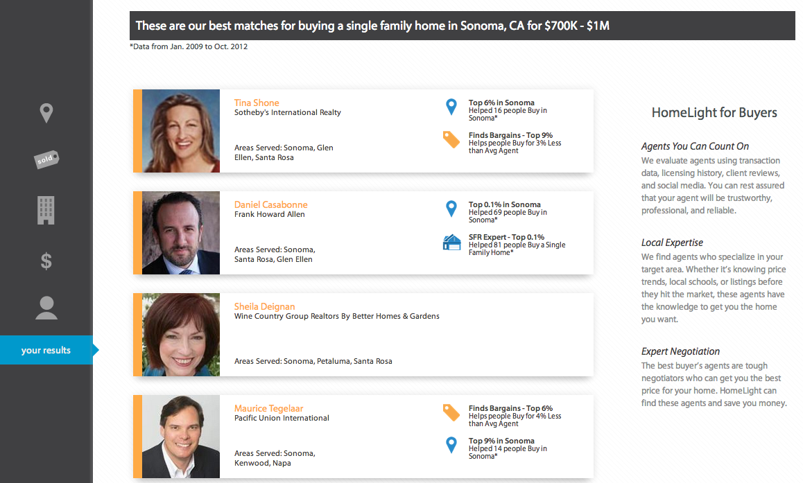 On the front end, HomeLight offers a simple real estate agent search engine which users can filter based on city, specific ‘hoods, property type, price range and areas of expertise. Once they’ve personalized their search criteria, the platform serves a list of agents based on their actual skill and experience in hopes of removing the guesswork from finding and discovering the best fit.