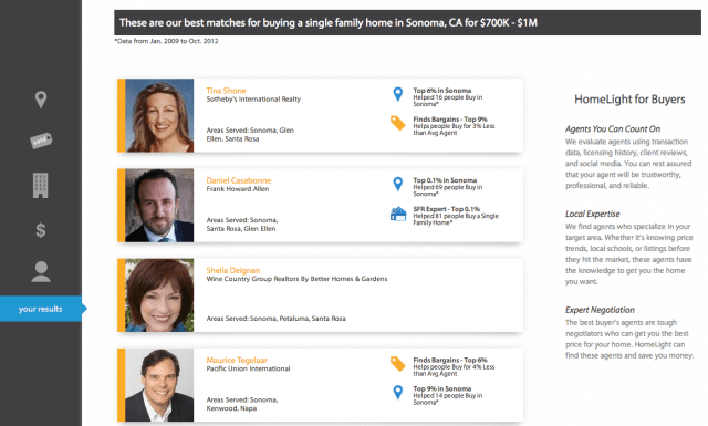 In the big picture, HomeLight thinks that this kind of matching platform has the potential to be far more valuable than, say, a social approach to recommendations (the likelihood is that friends have a limited data set and experience) or good old-fashioned search. While search engines may serve results from local firms, users are likely to run into the same problem — a limited data set that likely doesn’t inform you whether an agent focuses on first-time buyers or short-sales, how much experience they have, etc.