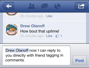 Facebook’s iOS users have long been able to tag friends in posts, but had to append them to the end of the update as “with [Drew Olanoff]”. That made for some funky grammar, or redundancy if you needed to refer to a specific friend in the text of your update. Now you can tag friends in-line so your prose flows.