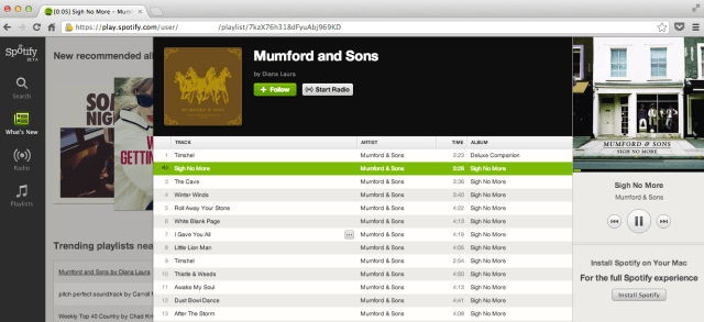 One noticeable absence is the Play Queue section, which lets see what you’ve got coming next and as well as your listening history. Another is the Spotify third-party app platform. You won’t find Pitchfork’s curated playlists or Last.fm’s personalized recommendations. However, I’d imagine the app platform may be ported to the browser version eventually.