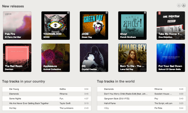 A nice addition to the What’s New section is top tracks in the world. There you’ll find your favorite horse dancer PSY’s “Gangnam Style” to contrast with America’s love of country music. The browser version currently lacks the Top Lists section, though. This let you go past the top 5 tracks and explore the top 100 songs or albums in any country or the world.
