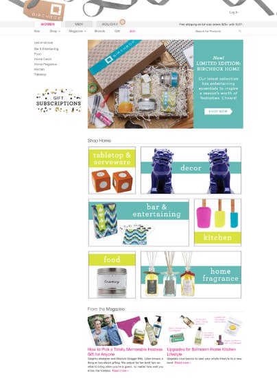 The Birchbox Home store features a handpicked selection of home design and lifestyle products and relating content. Products include tabletop accessories by C. Wonder and gourmet sugar from Chambre de Sucre. Accompanying editorial content will spotlight brands, designs and new trends.