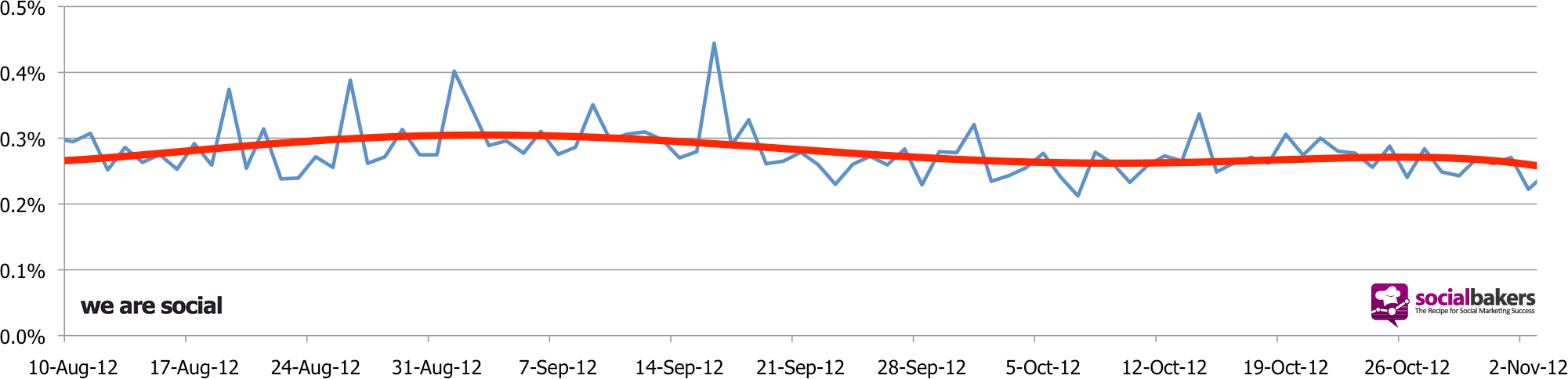 And as we found before, despite the drop in reach, the average page post engagement rate has stayed fairly steady during the period: