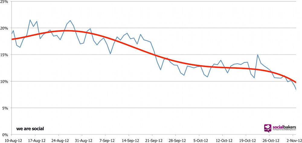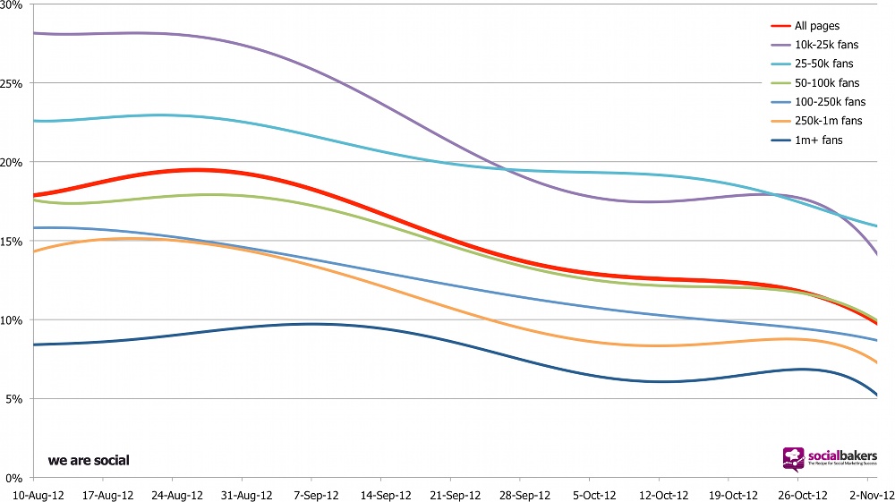 Since the end of August there has been a precipitous drop in reach across pages of all sizes, there have been first hand reports of Facebook telling agencies who manage large numbers of pages for clients that they were going to experience a large drop in reach, and data clearly showing this drop from at least three independent sources – Facebook page analytics provider EdgeRank Checker, the head of social measurement at WPP’s Team Detroit and a study conducted by us here at We Are Social in conjunction with Socialbakers.