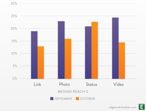 Interestingly, EdgeRank Checker has just released some follow-up research also showing a big drop in reach from September to October, drilling down into the average reach of different post types: