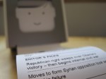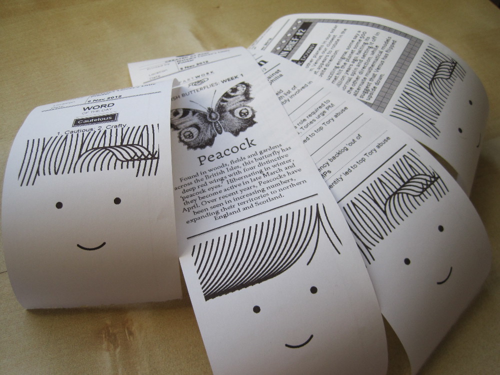 The cloud printer connects to your router, via a bridge, and is controlled via a smartphone (plus a single button on top that you push to trigger each print-out). Once you’ve registered and logged in to BERG’s cloud platform you can send it messages for printing. You can also share the printer so other people can send you paper missives. On top of that, there are a range of what BERG calls publications you can subscribe to (for free) and schedule for regular deliveries — such as news digests, puzzles, science facts, Facebook birthdays, calendar info, word of the day or even print out your friends’ recent Foursquare checkins. (For more on the content currently on offer see the ‘Publications’ section of this page.) BERG is hoping to keep increasing the choice of publications — so buying the Little Printer is a bit of a leap of faith, since you’re spending on something that might blossom into a rich and vibrant ecosystem. Or pull up short after a brief run — a la the Nabaztag Wi-Fi rabbit.
