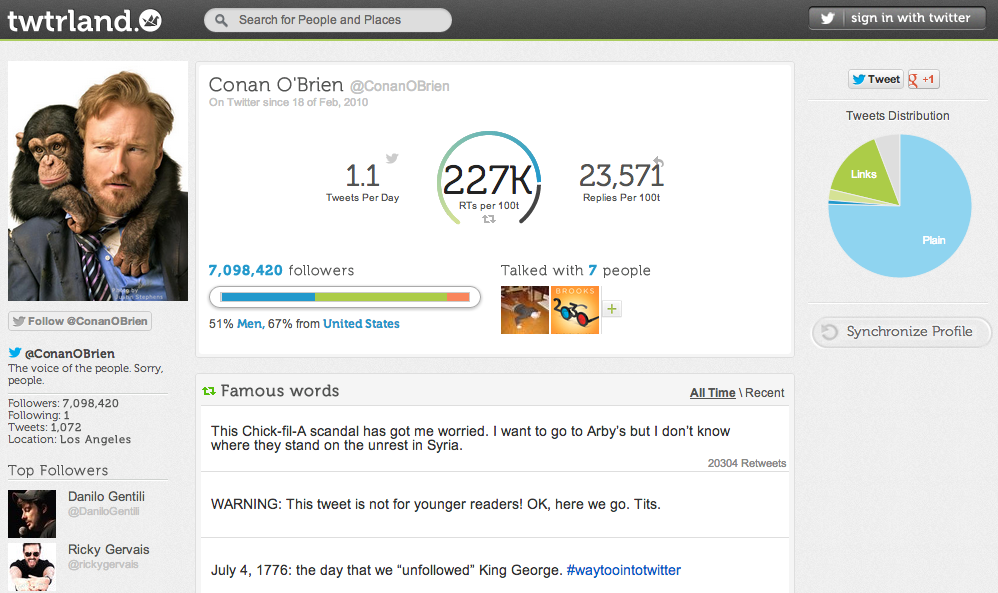 It’s not exactly clear how it’s determining “celebrities” or “Top Twitter Users,” although it does seem to take into account the number of followers they have, activity and context. On its site, TwitterLand doesn’t share much: “We have our own magic formula for deciding who is a top follower. Be aware that this list is based on users which have been generated atleast once on twtrland, and are in the first 5000 followers of the searched user.”
