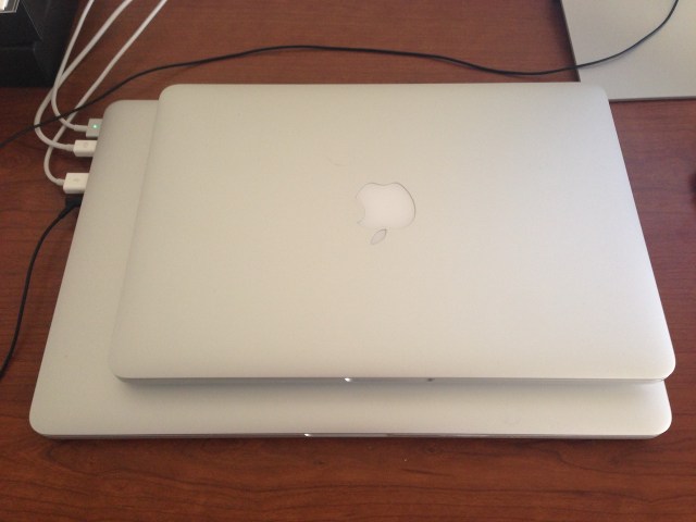Above: the 13-inch retina MacBook Pro on top of the 15-inch retina MacBook Pro