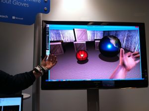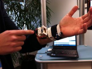 On a press visit to Microsoft’s Cambridge Research lab, we are shown a glimpse of the huge variety of research projects bubbling away underneath the quiet corporate facade however modest its budget: from projects using machine learning to harness the power of big data to make better predictions about the Earth’s climate; to research into new user interface mechanisms that blend the real and the virtual so you can ‘hold’ a 3D ball of pixels in your hand; to a PhD project recycling Kinect components to fashion a wrist-mounted glove-less finger-motion-capturing device (below); to multidisciplinary research looking at making biological cells programmable using computer software.