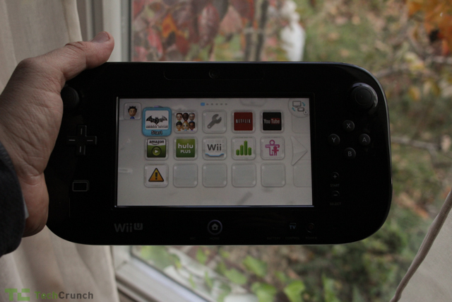 The first thing you’ll notice about the Wii U is that it comes in two parts. The console itself is a squat black box, about the same size as the original Wii, but with multi-gigabytes of built-in Flash storage and four USB ports. It supports HDMI and component video, runs an IBM Power processor with AMD Radeon GPU, and is compatible with the original Wii games. It is supposed to output 1080p video, a vast improvement from the Wii’s original 480p capabilities. This is a fully modern console with fully modern specs. I’ll spare you a rundown of the various physical aspects of the device simply because I’m sure they will be addressed ad nauseum on various gaming sites this week. The console itself in fact is the least interesting aspect of the Wii U package and the main UI, represented by icons that appear either on the included touchscreen GamePad or on the TV screen, is as uninspiring as a iconographic OS can be.