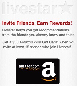 You can also easily get a $30 Amazon Gift Card for trying out Livestar. If you can get at least 15 friends to accept invites and try the app, you’ll get the card.