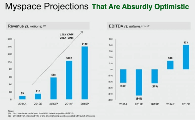 Unless Specific Media hits a home run with the new streaming music service it’s raising $50 million to pivot Myspace into, its bargain basement buy of the social network for just $35 million in 2011 could be a disaster. Slides attained by Business Insider shows Myspace will lose $43 million in 2012 on revenue of just $15 million. Yet somehow it thinks the notoriously tough music biz will save it.